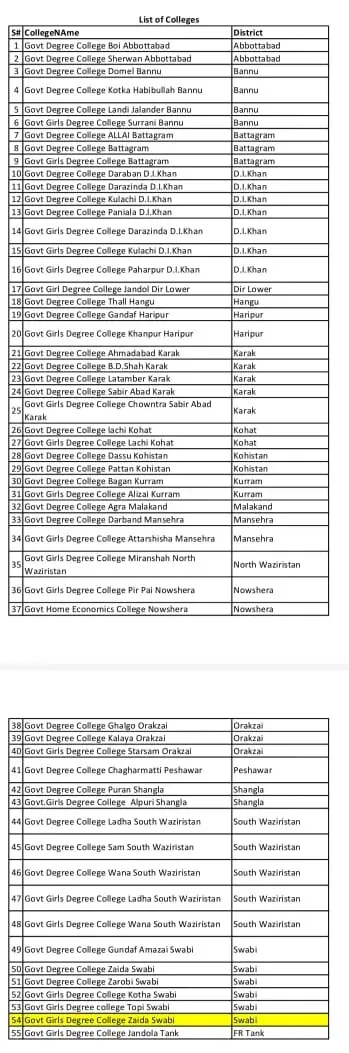 خیبرپختونخوا کے ضلع ایبٹ آباد، ہری پور، مانسہرہ، نوشہرہ، کرم، شانگلہ اور کوہستان کے دو، دو کالجز جب کہ پشاور، ہنگو، دیر لوئر، مالاکنڈ، شمالی وزیرستان اور ایف آر ٹانک کا ایک ایک کالج نجکاری کے زمرے میں آیا۔