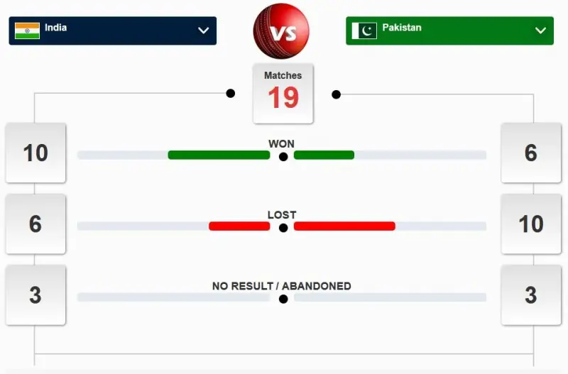 روایتی حریفوں کے وائٹ بال ہیڈ ٹو ہیڈ میں بھارت بہت آگے ہے، ایشیا کپ میں پاکستان اور بھارت کے درمیان مجموعی طور پر 19 میچز ہوئے، جن میں بھارت نے 10 میچوں میں فتح حاصل کی جب کہ پاکستانی ٹیم 6 میں میدان مار سکی اور 3 مقابلے بغیر کسی نتیجے کے ختم ہوئے۔