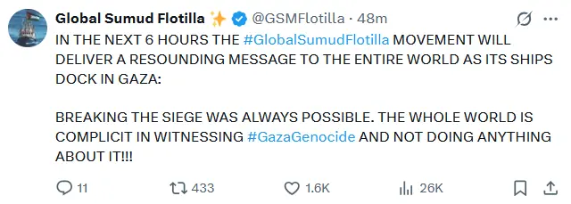 گلوبل صمود فلوٹیلا کے ایکس اکاؤنٹ سے جاری پوسٹ میں کہا گیا ہے کہ ’اگلے چھ گھنٹوں میں فلوٹیلا کے جہاز غزہ کی بندرگاہ پر لنگر انداز ہوں گے تو گلوبل صمود فلوٹیلا کی تحریک پوری دنیا کو ایک پیغام دے گی کہ محاصرہ توڑنا ہمیشہ ممکن تھا۔ پوری دنیا غزہ میں جاری نسل کشی کو اپنی آنکھوں کے سامنے دیکھ رہی ہے اور کچھ نہیں کر رہی‘۔