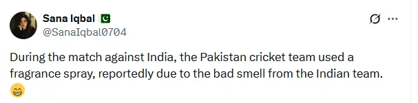 ایک صارف نے ٹویٹ کیا کہ انڈیا کے خلاف میچ کے دوران، پاکستانی ٹیم نے بدبو کی وجہ سے خوشبو دار اسپرے استعمال کیا۔
