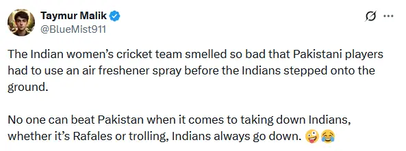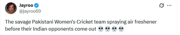 ایک صارف کا ایکس پر طنزیہ پیغام تھا کہ بھارتی ٹیم کی اسمیل ایسی تھی کہ پاکستانی کھلاڑیوں نے انہیں گراؤنڈ پر جانے سے پہلے اسپرے کرنا پڑا، اور ٹیموں کے درمیان مقابلہ ہو یا مزاحیہ ٹرولنگ، بھارت ہمیشہ ہارا۔