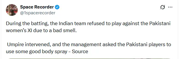 دوسری طرف، بھارتی صارفین بھی پیچھے نہیں رہے اورسوشل میڈیا پر اپنا حصہ ڈالا، ایک صارف نے ٹویٹ کی کہ ’بیٹنگ کے دوران، بھارتی ٹیم نے بدبو کی وجہ سے پاکستانی ویمنز ٹیم کے خلاف کھیلنے سے انکار کر دیا۔ امپائر مداخلت کے لیے آئے اور انتظامیہ نے پاکستانی کھلاڑیوں کو اچھا ڈیوڈورینٹ یا خوشبو دار اسپرے استعمال کرنے کا کہا۔‘