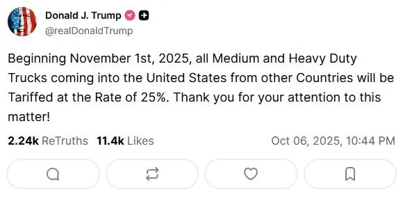 صدر ٹرمپ نے پیر کے روز سوشل میڈیا اکاؤنٹ ”ٹروتھ“ پر پوسٹ کرتے ہوئے کہا کہ “یکم نومبر 2025 سے دیگر ممالک سے امریکا آنے والے تمام درمیانے اور بھاری ٹرکوں پر 25 فیصد ٹیرف عائد کیا جائے گا۔”
