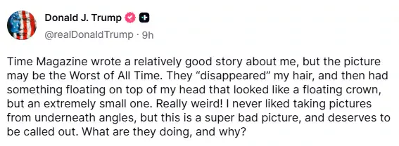 ٹرمپ نے اپنے پیغام میں لکھا، ’ٹائم میگزین نے میرے بارے میں ایک نسبتاً اچھا مضمون لکھا، لیکن تصویر بالکل ناقابل برداشت ہے۔ انہوں نے میرے بال غائب کر دیے اور سر کے اوپر کچھ ایسا دکھایا جو بہت عجیب تھا، ایک چھوٹی سی تیرتی ہوئی تاج جیسا تھا۔ یہ بالکل عجیب تھا!‘