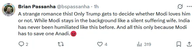 برائن پسنہا نامی صارف نے لکھا: ”یہ کیسی محبت ہے جس میں صرف ٹرمپ طے کرتا ہے کہ کون کس سے محبت کرتا ہے۔ مودی تو بیچاری خاموش بیوی بنے بیٹھے ہیں۔“