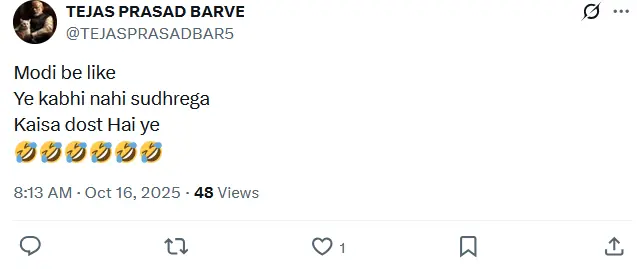 سوشل میڈیا پلیٹ فارم ’ایکس‘ پر تیجاس پرساد باروے لکھتے ہیں: ”مودی اندر ہی اندر سوچ رہے ہوں گے، یہ کب سدھرے گا؟ کیسا دوست ہے یہ!“