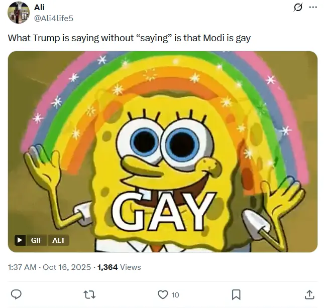 علی نامی صارف نے لکھا، ”ٹرمپ نے مودی کو ڈھکے چھپے الفاظ میں ہم جنس پرست کہا ہے“۔