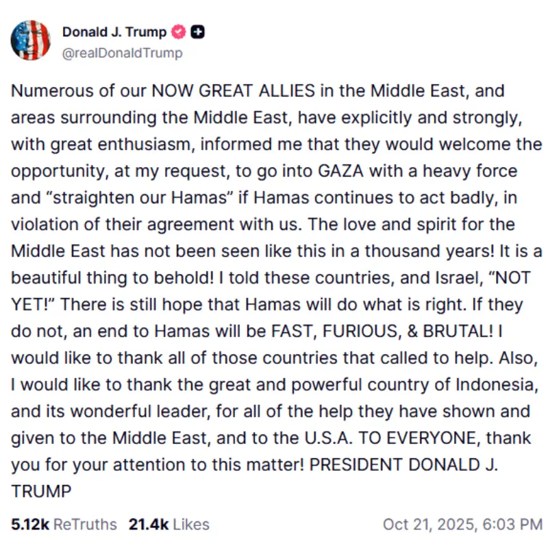 صدر ڈونلڈ ٹرمپ نے منگل کو اپنے سوشل میڈیا پلیٹ فاریم ٹروتھ سوشل پر ایک پوسٹ میں لکھا کہ، ”مشرق وسطیٰ کے عظیم اتحادی اور دیگر ممالک نے نہایت خوشی کے ساتھ مجھے کہا ہے اگر حماس معاہدے کی خلاف ورزی کرتا ہے تو وہ میری درخواست پر غزہ میں بھاری فورس کے ساتھ داخل ہو کر حماس کو سبق سکھائیں گے۔“