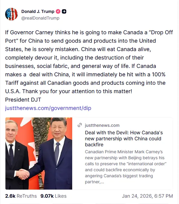 صدر ٹرمپ کا کہنا تھا کہ اگر کینیڈا نے چین سے معاہدہ کیا تو امریکا میں داخل ہونے والی تمام کینیڈین مصنوعات پر فوری طور پر 100 فیصد ٹیرف عائد کر دیا جائے گا۔